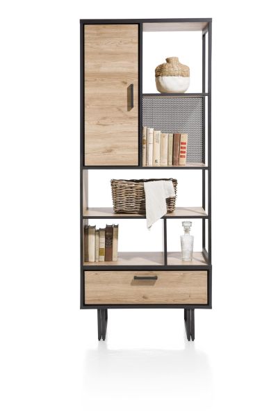 Stilvolles Design mit modernem Vintage-Charme Das Henders & Hazel Avalon Bücherregal verbindet modernes Design mit einem Hauch von Vintage-Charme und wird so zum Blickfang in jeder Einrichtung. Mit seinen klaren Linien, den schwarzen Metallakzenten und den robusten Beinen fügt es sich nahtlos in moderne Wohnstile ein. Gleichzeitig verleihen die warmen HPL-Oberflächen dem Regal einen wohnlichen Charakter, der perfekt für Liebhaber stilvoller und funktionaler Möbel ist. Viel Stauraum für Ihre Bedürfnisse Dieses multifunktionale Bücherregal bietet nicht nur ästhetische Vorzüge, sondern auch praktische Funktionalität. Mit einer cleveren Kombination aus einer Tür, einer Schublade und fünf offenen Fächern schaffen Sie mühelos Ordnung in Ihrem Zuhause. Ob Bücher, Dekorationsgegenstände oder persönliche Schätze – das Avalon Bücherregal bietet Platz für alles, was Sie präsentieren oder sicher verstauen möchten. Vielseitig einsetzbar und langlebig Dank seines durchdachten Designs und der